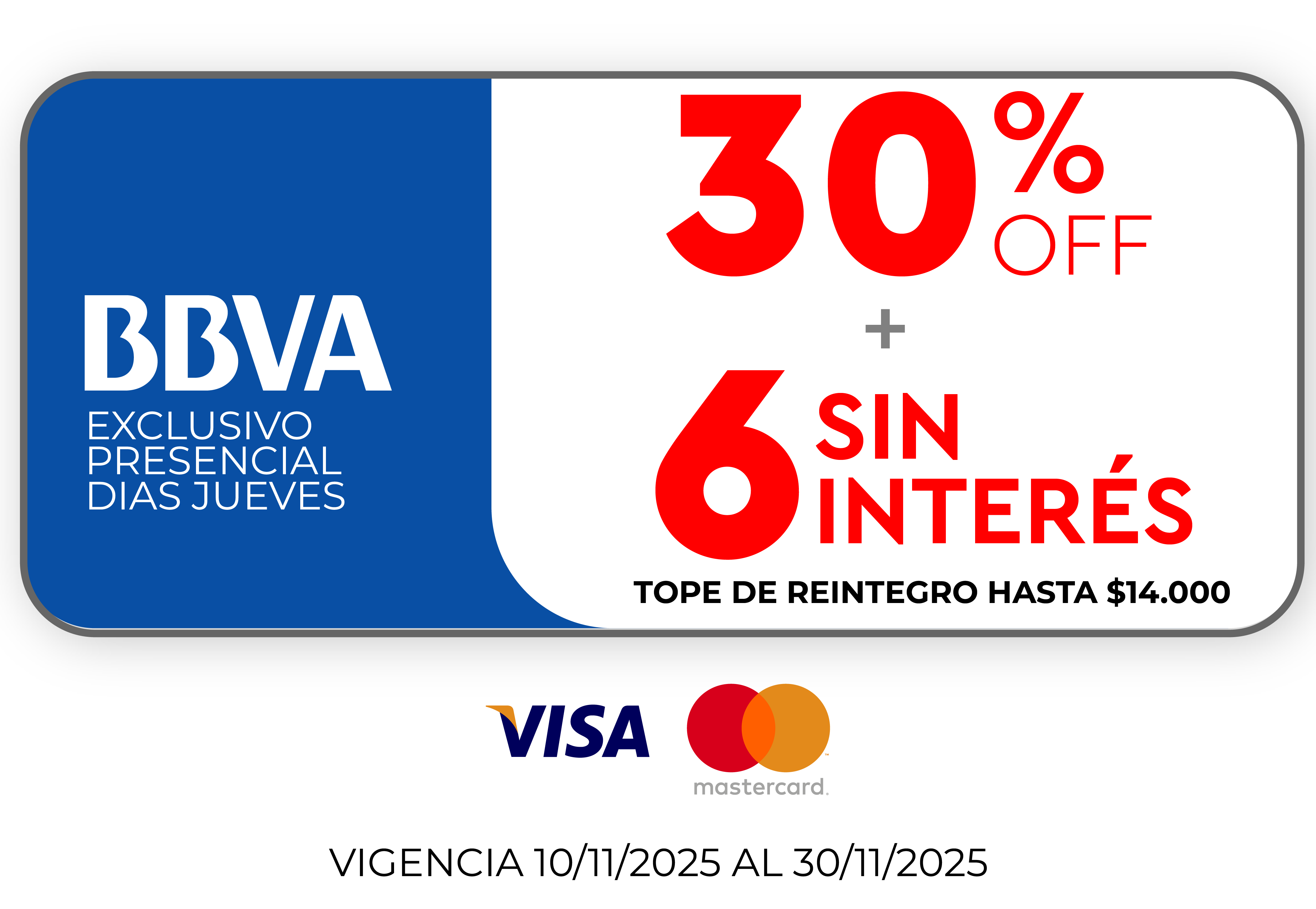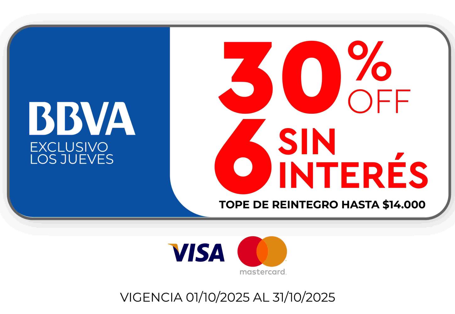 Promoción BBVA: 30% de reintegro y hasta 6 cuotas sin interés en todos los productos abonando con tarjetas Visa y Mastercard de Banco BBVA. Vigente exclusivamente para compras de manera presencial en cualquiera de las sucursales de Tienda Fava, los días JUEVES comprendidos entre el 03/11/2025 al 30/11/2025. Tope de reintegro hasta $14.000 por mes. El descuento se aplica sobre el precio de lista. CFT 0,00% (Costo Financiero Total).TNA 0,00% (Tasa Nominal Anual).TEA 0,00% (Tasa Efectiva Anual). Fava Hnos Sacif, Cuit 30-50085237-9 - Casa Central: Av.Luro 3247, Mar del Plata Provincia de Buenos Aires- Argentina.