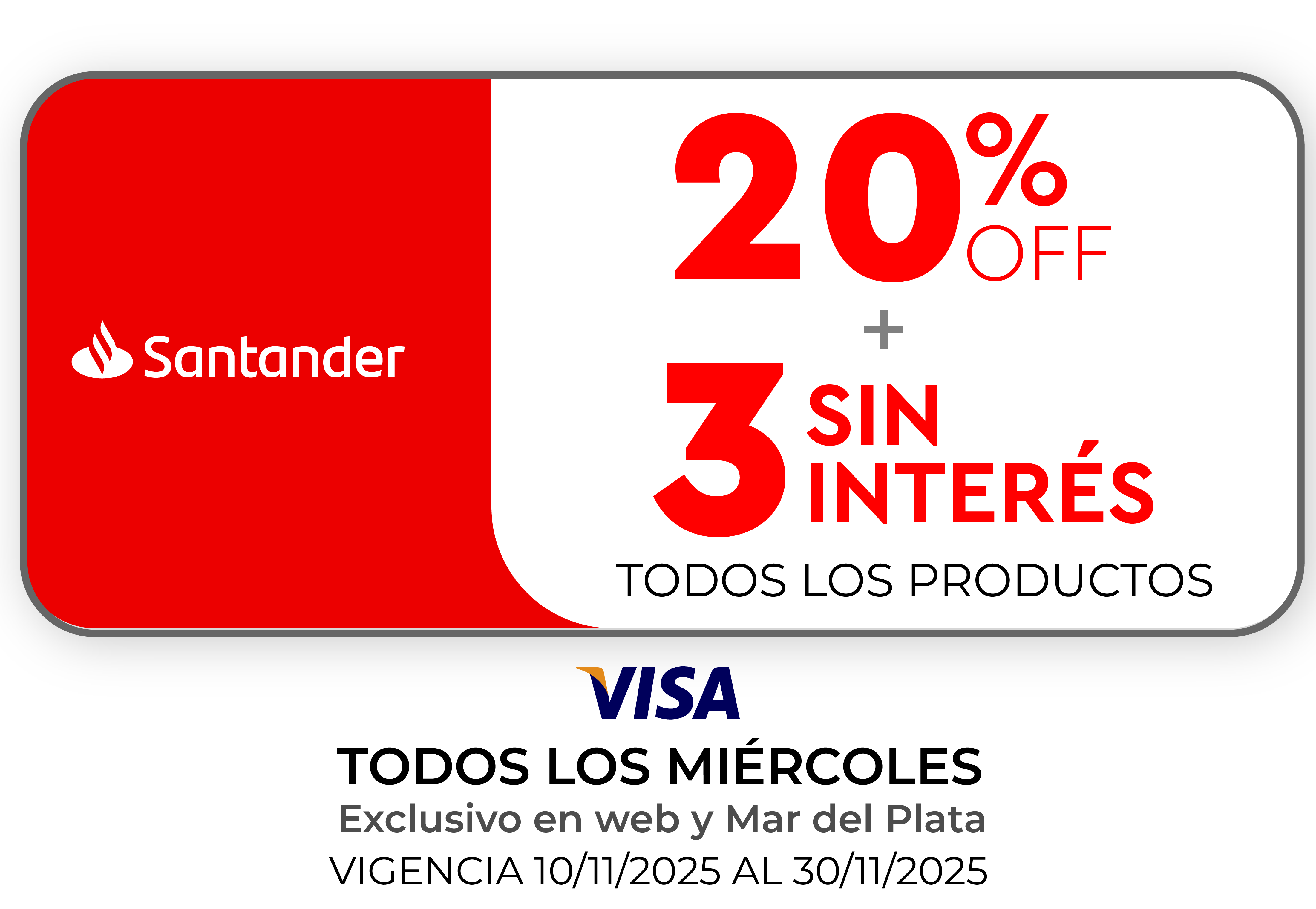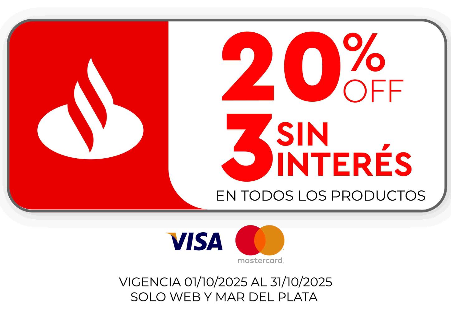 Promoción Banco SANTANDER: 20% de descuento y 3 cuotas sin interés en todos los productos o hasta agotar stock de 5 uni. Vigencia del 03/11/2025 al 30/11/2025. El descuento se aplica sobre el precio de lista. Promoción válida los días MIERCOLES abonando con tarjeta Visa de Banco Santander. Exclusivo para compras realizadas de manera presencial en sucursales de la localidad de Mar del Plata (Casa Central - Suc. Puerto y Suc. El Gaucho) o a través de la web www.fava.com.ar. ).CFT 0,00% (Costo Financiero Total).TNA 0,00% (Tasa Nominal Anual).TEA 0,00% (Tasa Efectiva Anual). Fava Hnos Sacif, Cuit 30-50085237-9 - Casa Central: Av. Luro 3247, Mar del Plata Provincia de Buenos Aires- Argentina.