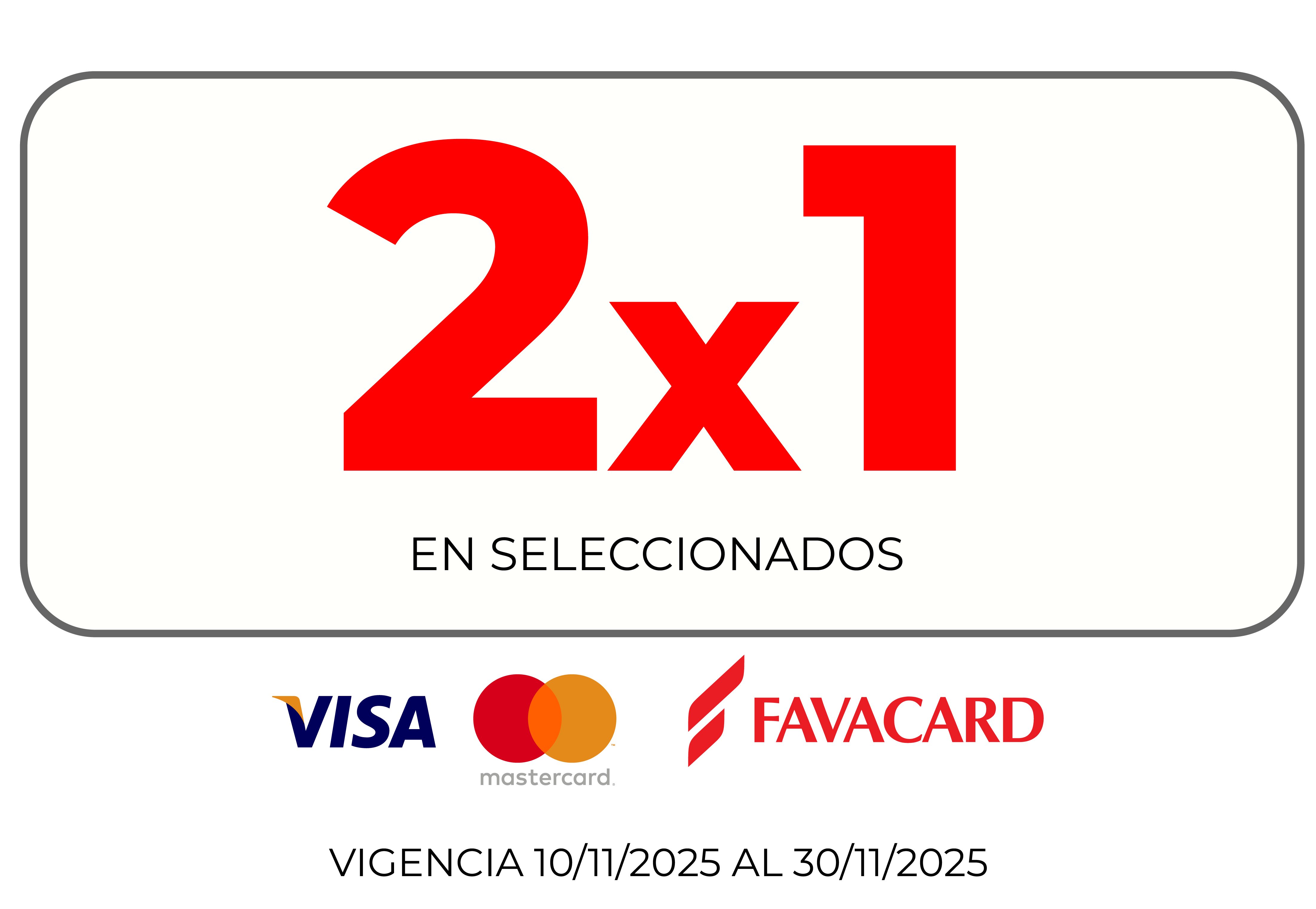 2X1 : Promoción vigente en artículos seleccionados. Vigente desde el 10/11/2025 al 30/11/2025 o hasta agotar stock de 5 uni. Válido para compras realizadas con Visa, Mastercard (bancarizadas) y Favacard. No acumulable con otras promociones vigentes en la misma fecha. CFTNA 0,00% (Costo Financiero Total Nominal Anual).CFT 0,00% (Costo Financiero Total).TNA 0,00% (Tasa Nominal Anual).TEA 0,00% (Tasa Efectiva Anual).+ Info en ww.fava.com.ar/cybermonday. Fava Hnos Sacif, Cuit 30-50085237-9 - Casa Central: Av.Luro 3247, Mar del Plata Provincia de Buenos Aires- Argentina.