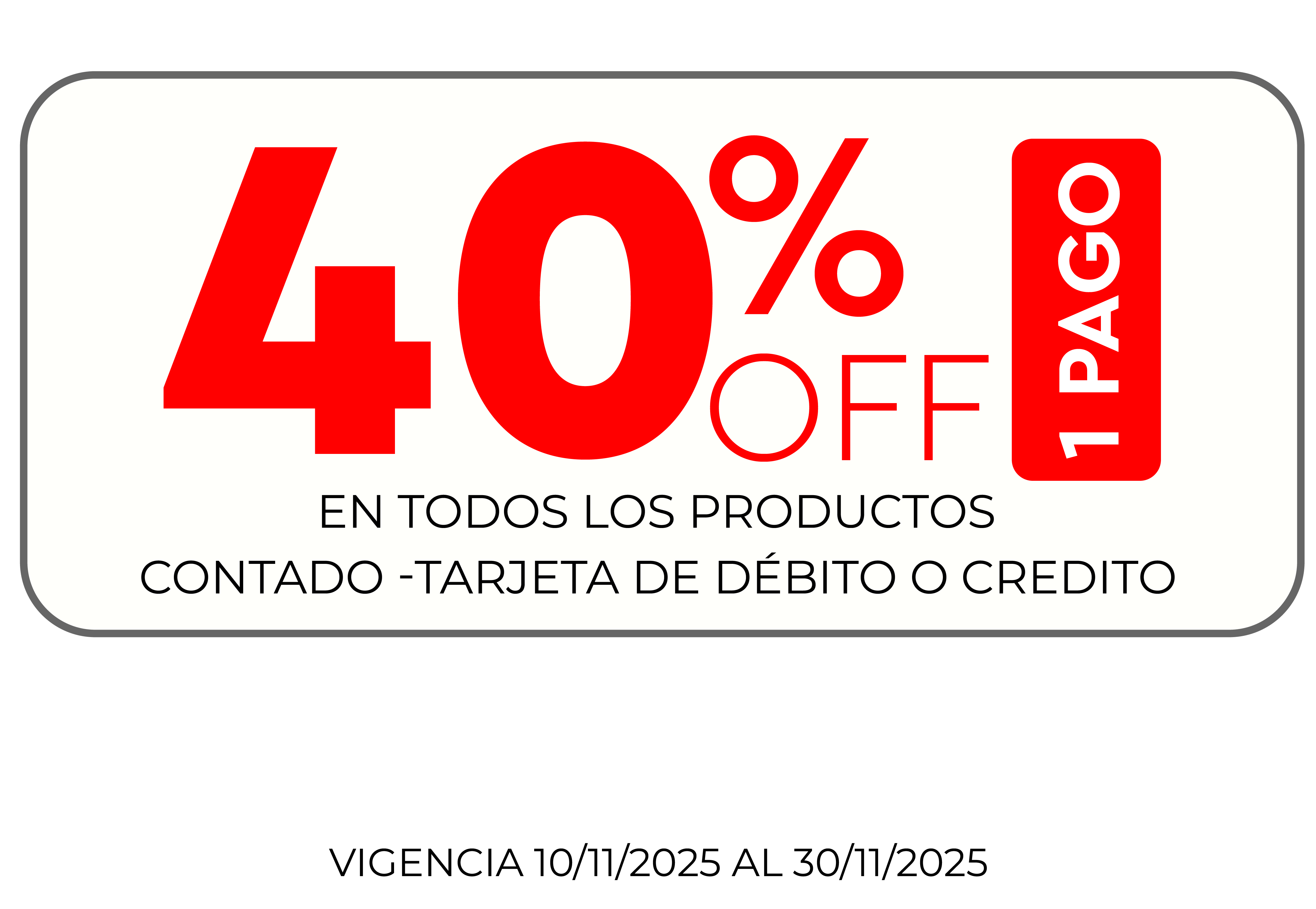 Promoción 40% off 1 pago: 40% de descuento en 1 pago en todos los productos. Vigente desde el 10/11/2025 al 30/11/2025 o hasta agotar stock de 5 uni. Promoción sin tope de reintegro. El descuento se aplica sobre el precio de lista. Válido para compras efectuadas en sucursales, venta telefónica y venta web, abonando con cualquier medio de pago. Fava Hnos Sacif, Cuit 30-50085237-9 - Casa Central: Av.Luro 3247, Mar del Plata Provincia de Buenos Aires- Argentina.